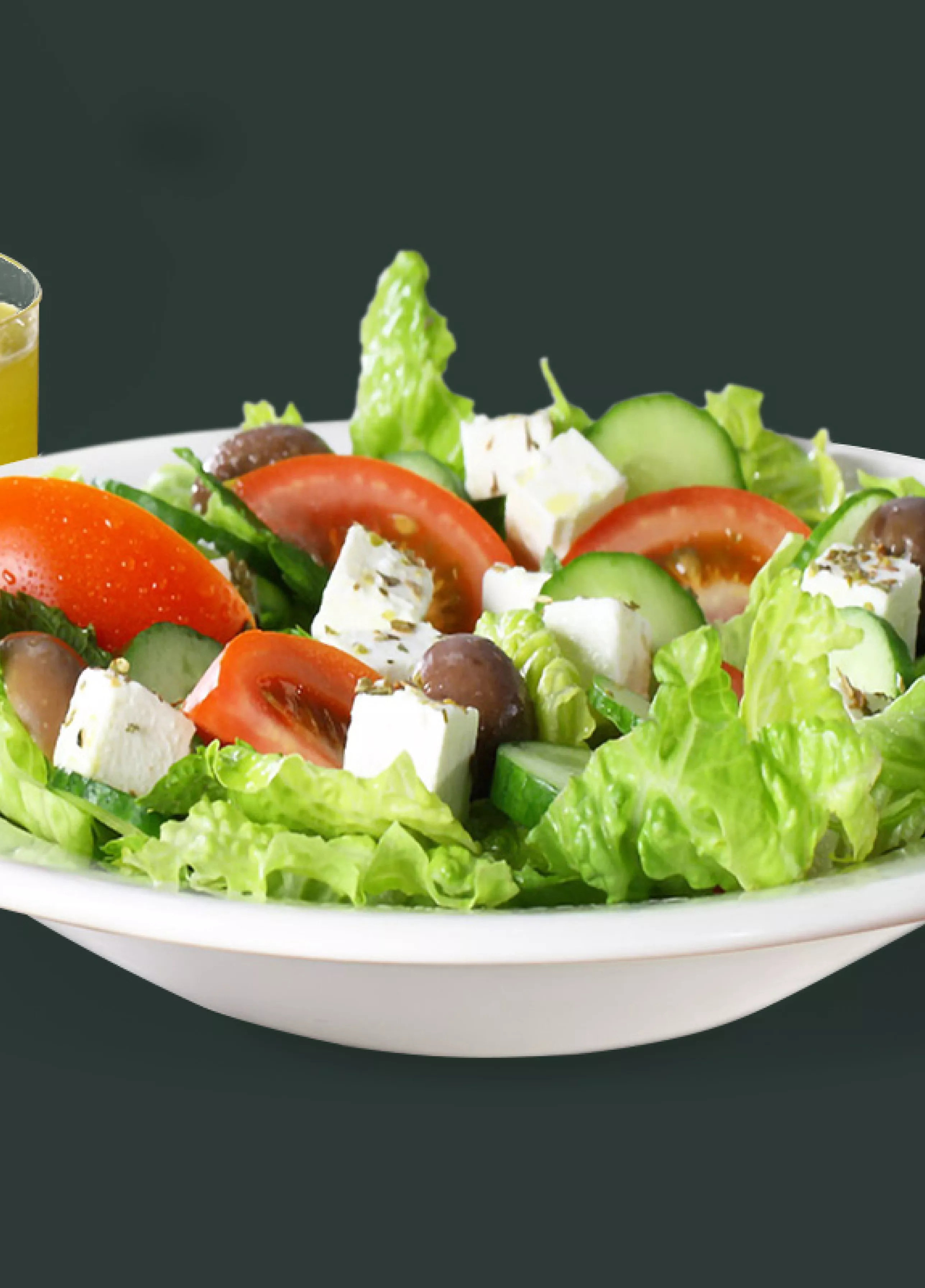 A favorite classic, a vibrant and light mixture of crispy iceberg lettuce, cherry tomatoes, cucumbers, bell peppers and black olives with tangy feta cubes and a refreshing dijon vinaigrette